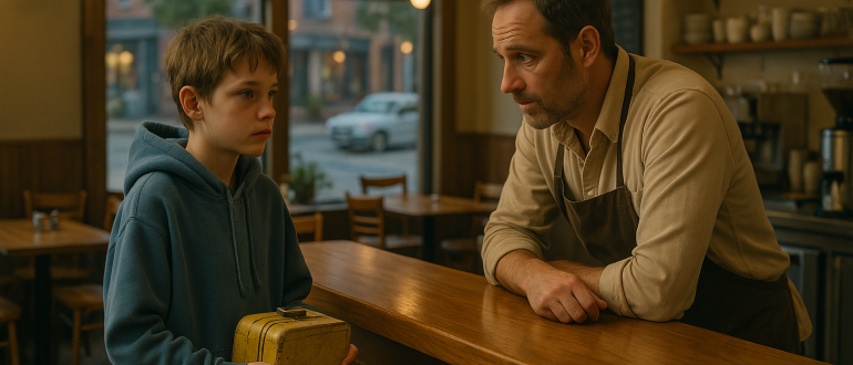 Fant, ki je v kavarno nenehno prinašal plastično škatlo za malico in prosil za »otroško porcijo za domov«, je nekega deževnega večera končno prepričal lastnika, da mu sledi.