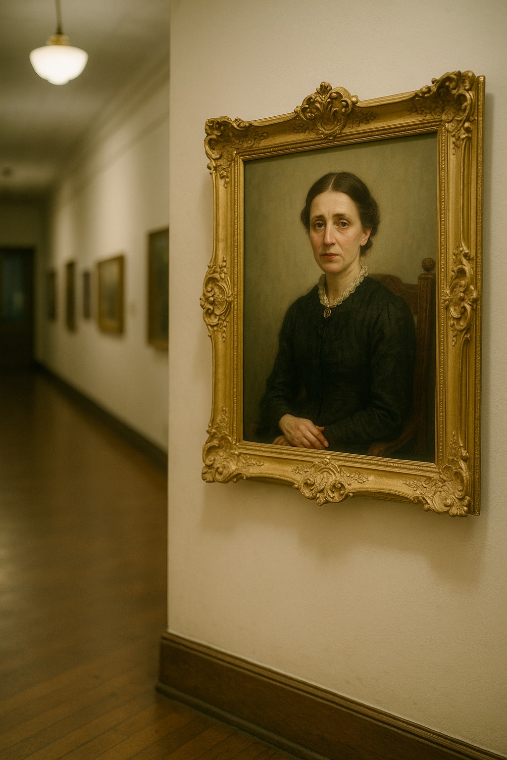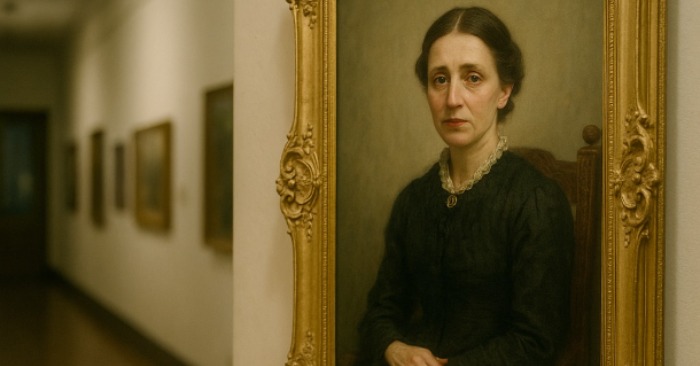 Visel je na samem zadnjem delu glavne dvorane, v težkem zlatu okvirju. Viktorijanska ženska, naslikana v umirjenih oljnih barvah, je sedela na stolu z visokim naslonjalom, roke pa je imela lepo sklenjene v naročju. Nosila je črno obleko s čipko na ovratniku, na vratu pa se je lesketala majhna broška.