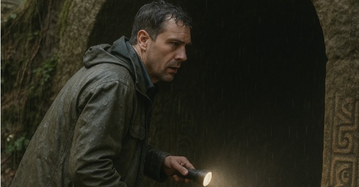 Zrak je bil takoj hladnejši, poln vonja po mokrem kamnu in zemlji. Stopnice so vodile v ozek prehod, stene so bile vlažne in tesne. Svetloba je ujela čudne oznake – spirale, križe in druge simbole, ki so se rahlo lesketali, kot bi bili namerno izklesani.