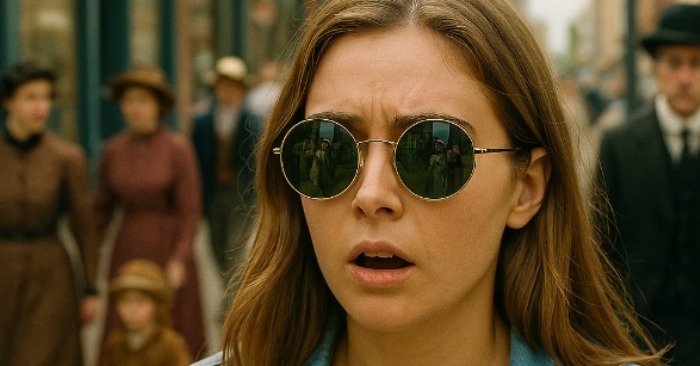 Med množico v vintage oblačilih so nekateri ljudje gledali naravnost vanjo. Moški s bledimi obrazi in vpadlimi očmi, ženske s trdno držo. Niso se premikali kot ostali – premikali so se proti njej.