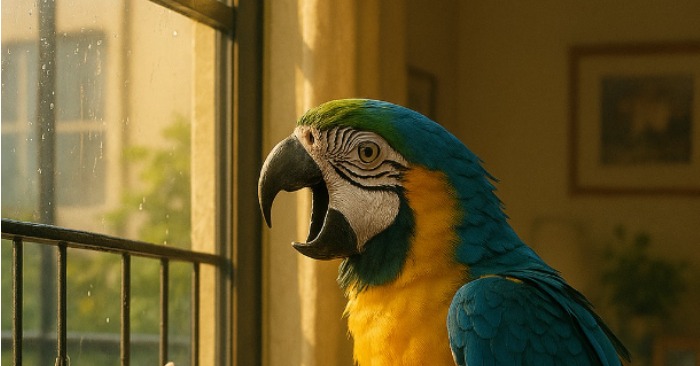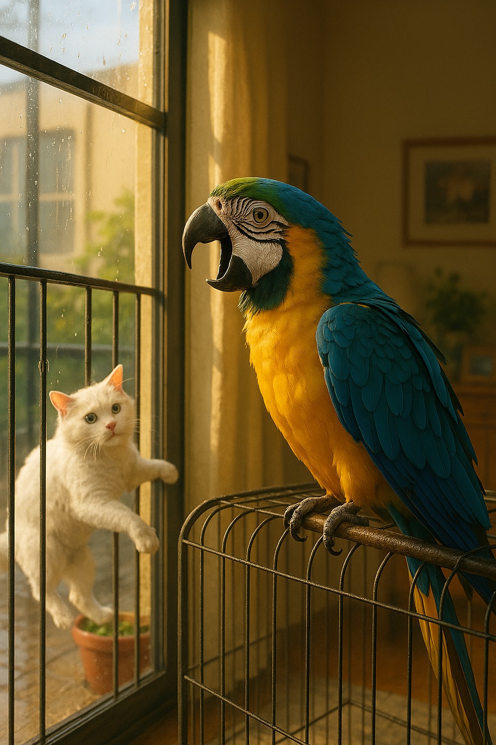 Papagaj je sedel na kletki z odprtim kljunom in ponavljal isto besedo, ki se je naučil, ko je vsak dan poslušal svojega lastnika, kako ljubeče kliče mačko: