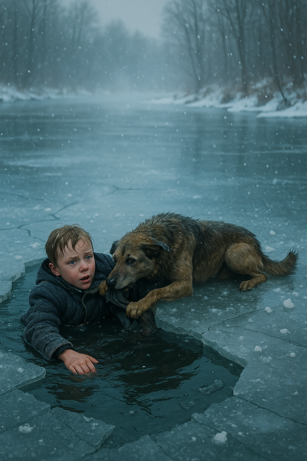 Sprva mu ni uspelo. Potem je led pod taco malo zdržal – in deček je zdrsnil na površino. Pes je nadaljeval z vlečenjem – dokler ga ni povlekel ven v celoti.