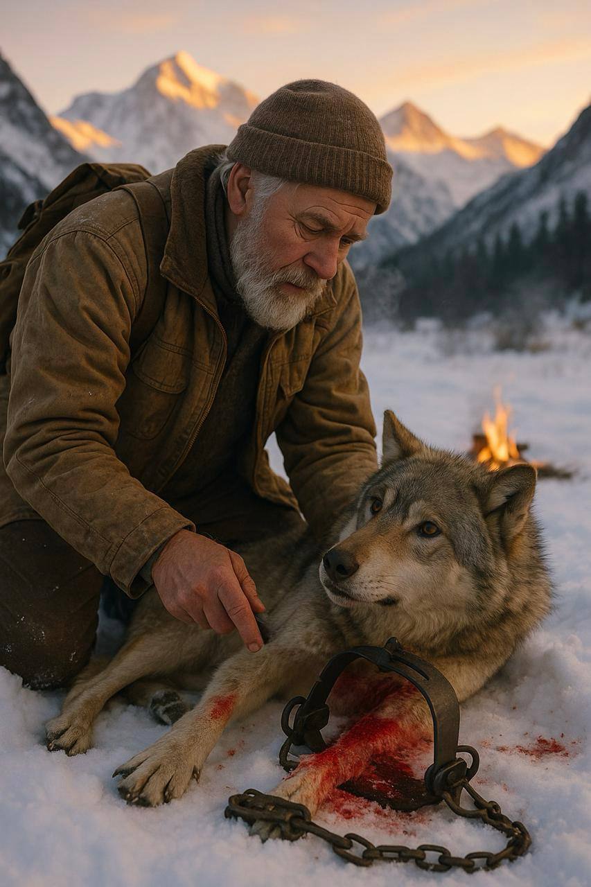 Tretji dan pohoda, ko se je že pripravljal postaviti šotor ob potoku, se je zaslišal čuden zvok. Ni bil samo veter – tiho, hripavo cviljenje. Aleksiej se je ustavil, prisluhnil in previdno razmaknil veje grmovja ter se odpravil v smeri zvoka. Po nekaj metrih je zagledal nekaj, kar ga je prisililo, da se je ustavil: v pasti iz kovinske zanke se je borila ogromna siva senca. Volk. Žival je bila izčrpana, taca okrvavljena, oči so gorele od bolečine in strahu.