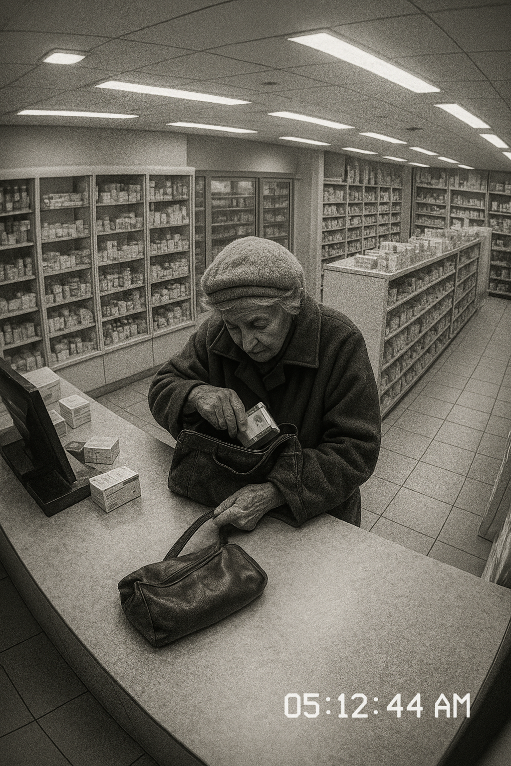 Babica je dolgo stala pred izložbo in v rokah stiskala majhen papirnat seznam. Vid ji je pešal, noge so se ji tresle, a kljub temu je ponovno prebrala imena, da se ne bi zmotila. To so bila zdravila, ki so ji jih predpisali po zadnji hospitalizaciji: tablete za srce, kapljice, mazilo. In najpomembnejše – drago zdravilo, brez katerega se je že po nekaj dneh počutila slabo.