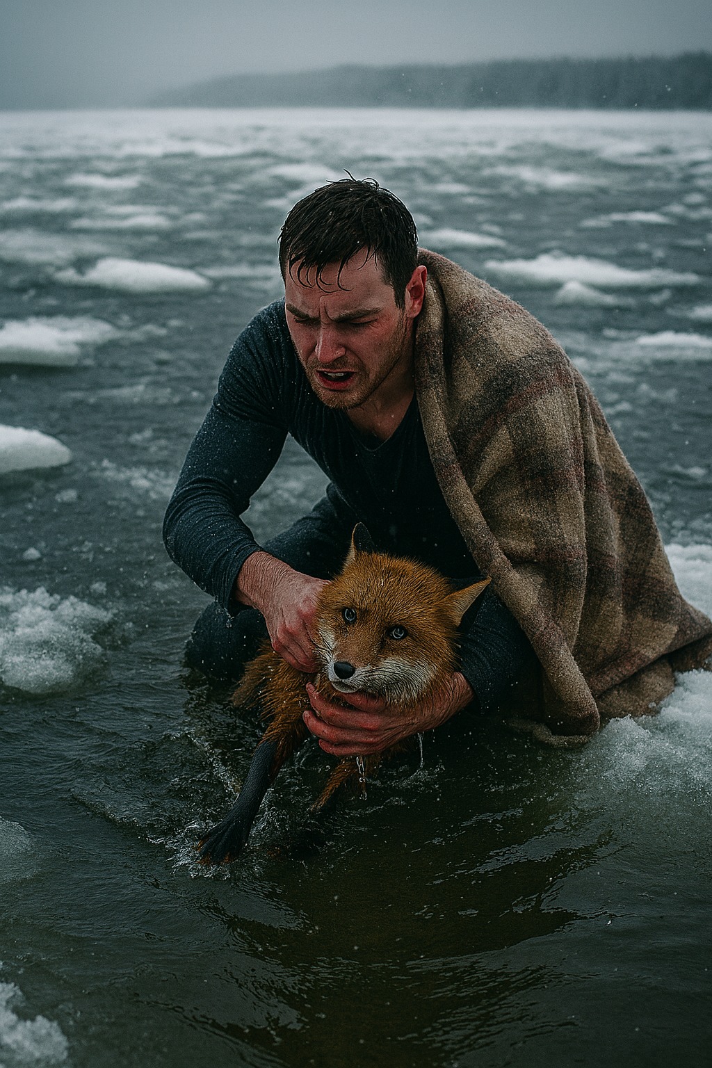 In nenadoma se je zaslišal obupan krik. Ni bil pasji. Tanek, prodoren, kot da bi nekdo majhen klical na pomoč. Ljudje so zagledali rdečkasto liso, ki se je obupano borila v ledeni vodi. Lisica. Mlada, izčrpana, ujeti med ledene plošče.