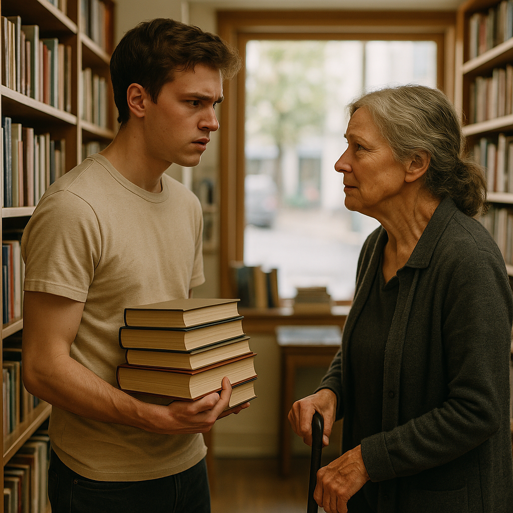 Pogledala je gor. Njene oči so bile utrujene, obdane s sencami. Za trenutek so zdrsnile po njem, kot da ne bi bil nihče, le še en neznanec v tihi trgovini. Nato so se okamenile.