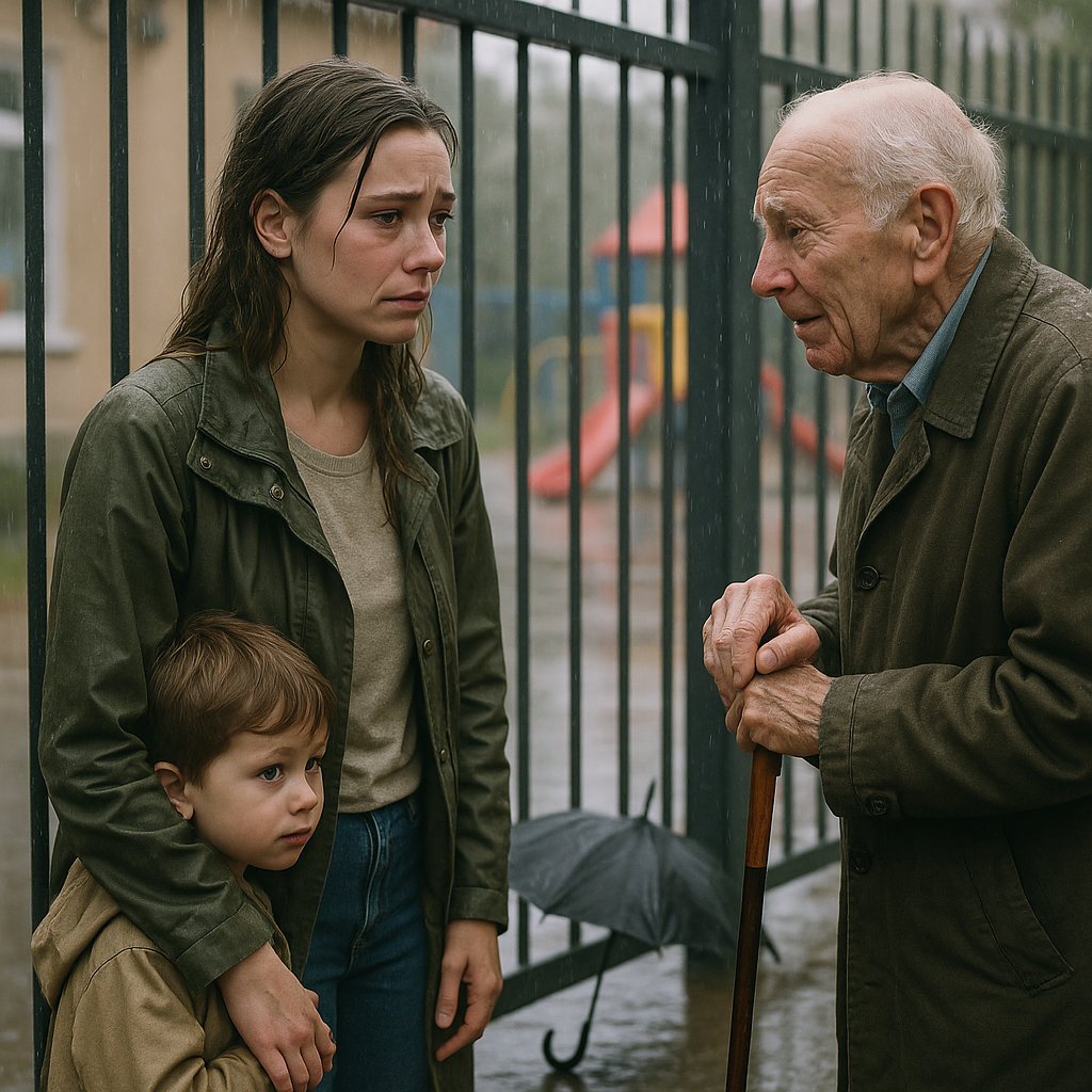 Emma je opazovala z vrat, prekrižala roke na prsih. Rosenje je igrišče spremenilo v zamegljen akvarel, sredi njega pa so stale tri postave ostre in resnične: ženska, ki se je še vedno borila z jezo, otrok, ki je odkrival družino, in starec, ki se je učil stati brez ograje.