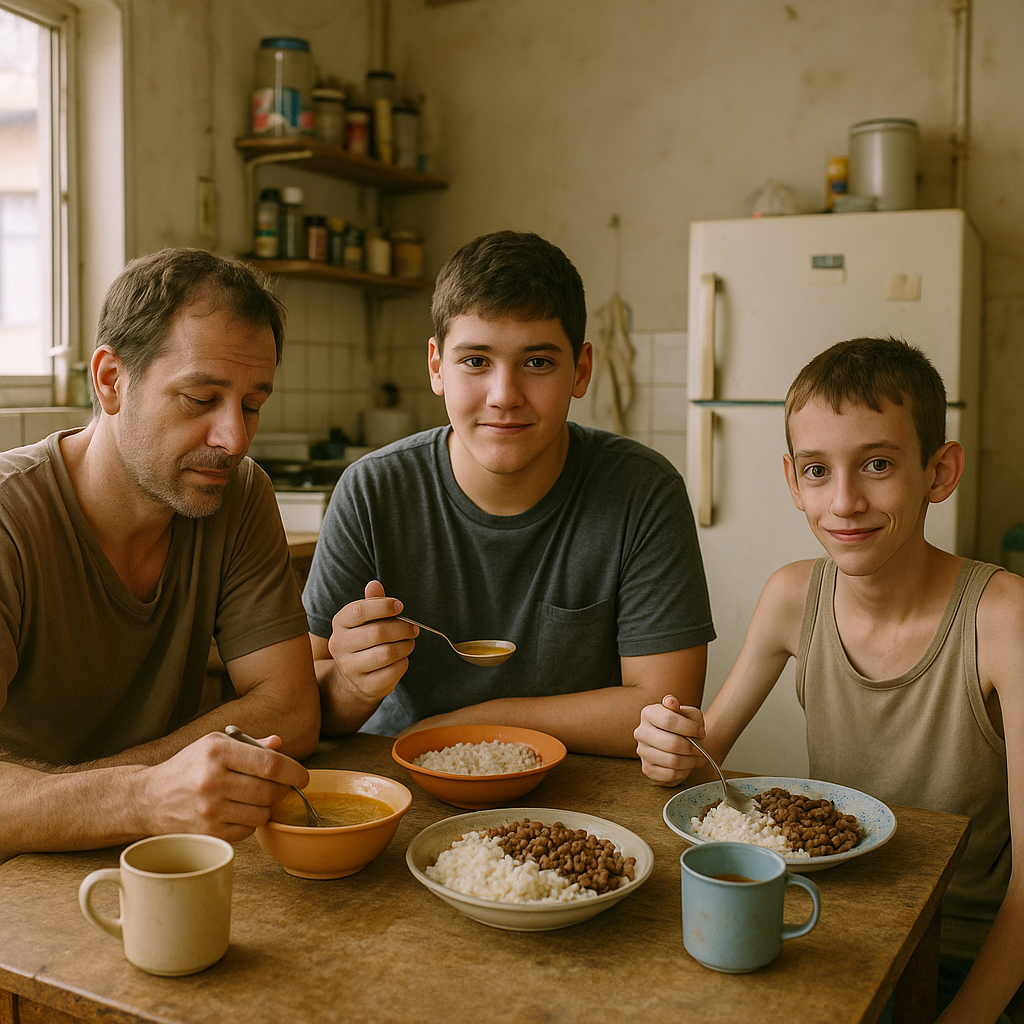 Noah je prišel z majhno skledo juhe in se opravičil, da je ni veliko. Oče je dodal še zadnje rezance in konzervo fižola. Jedli smo skupaj za majavo mizo – oče, jaz in fant, ki nas je na skrivaj hranil.