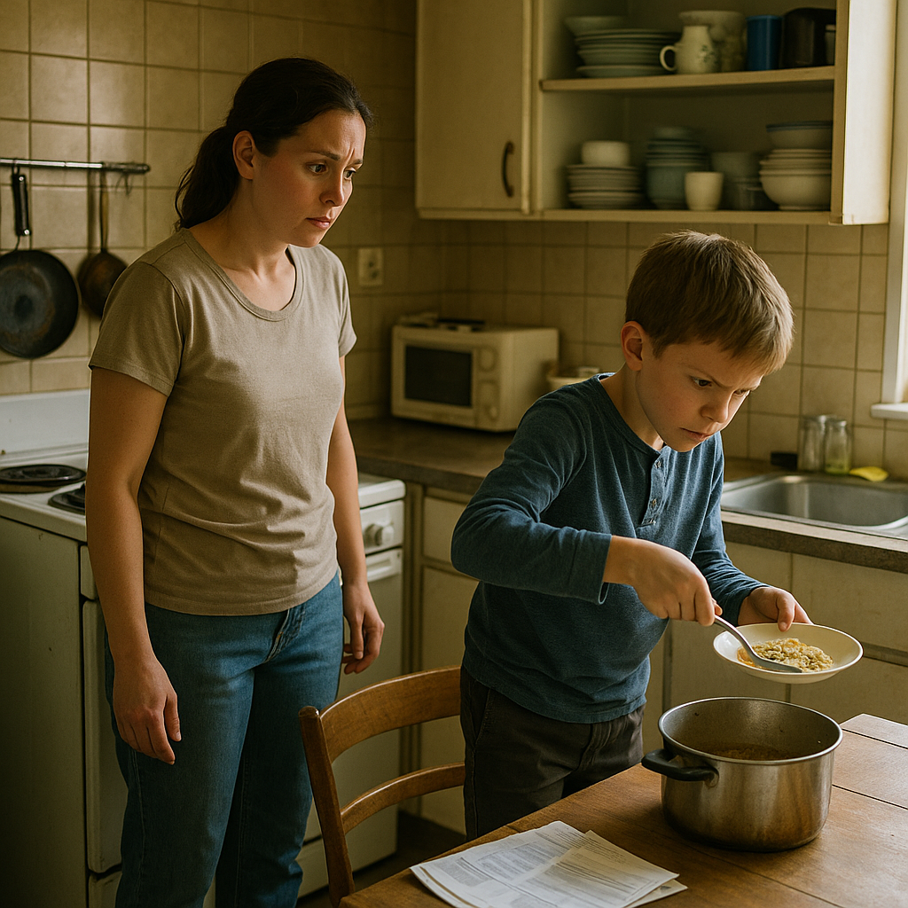 Toda nekega torka zvečer, ko se je prej kot običajno vrnila iz službe, je zagledala Noaha, ki je stal na stolu in previdno zajemal hrano iz lonca v majhen plastični krožnik. Njegova ramena so bila napeta, gibi hitri, krivi.