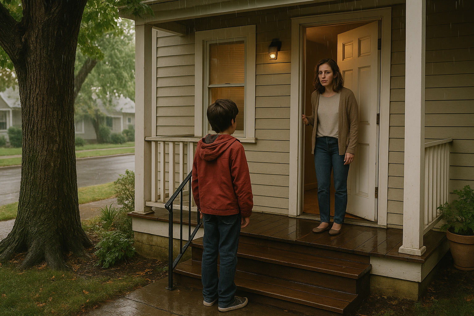 Na verandi je stal suh fant, morda desetleten, s temnimi lasmi, prilepljenimi na čelo. Stisnil je zmečkan nahrbtnik in me pogledal naravnost v oči, ne sramežljiv, ne drzen – samo … odločen.