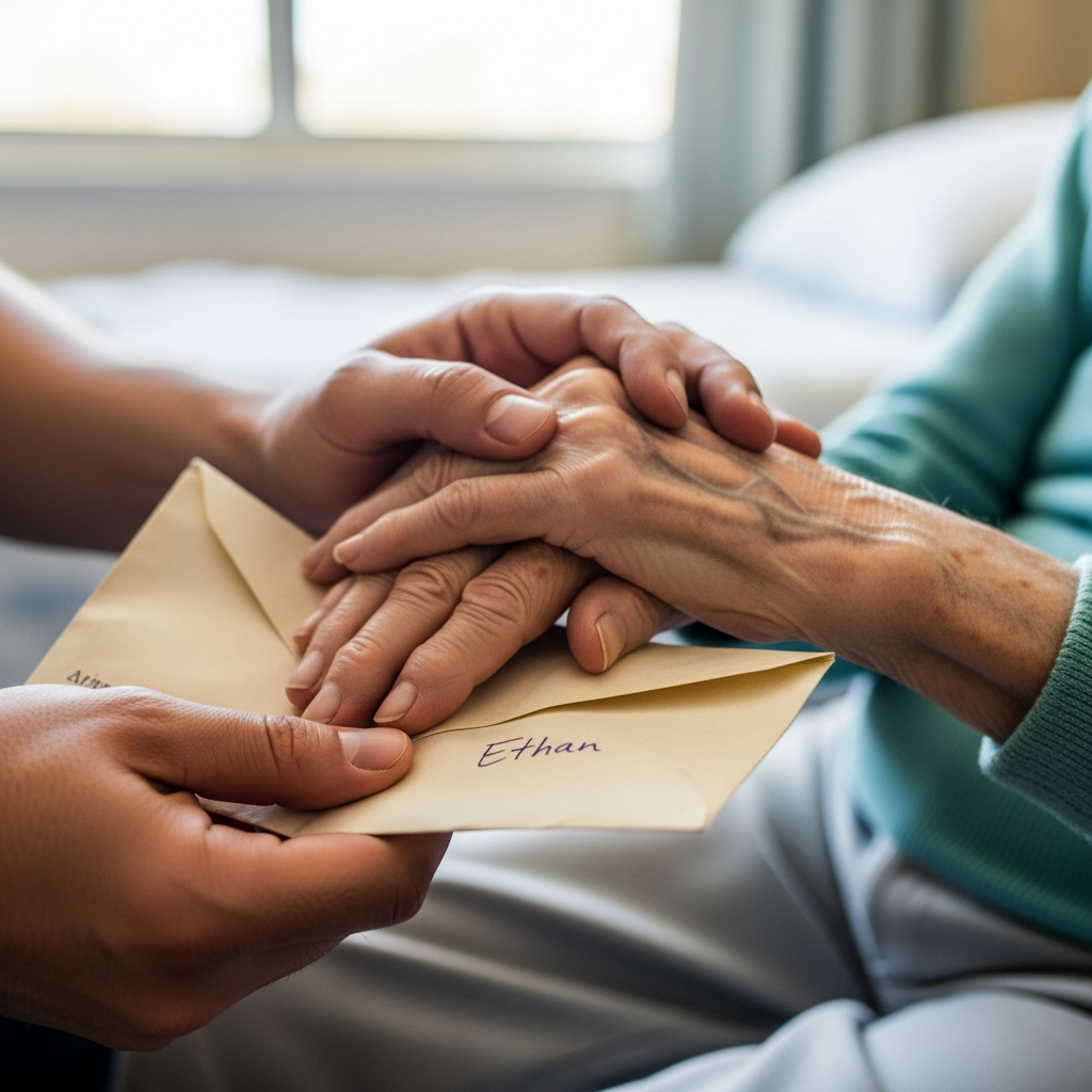 Ni takoj odgovoril. Namesto tega je segel – počasi, z vidnim naporom – po predalu nočne omarice. Izvlekel je prepognjeno ovojnico, robovi so bili obrabljeni od pretiranega prijema.
