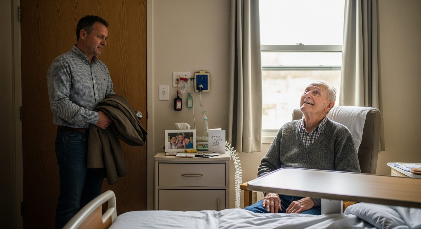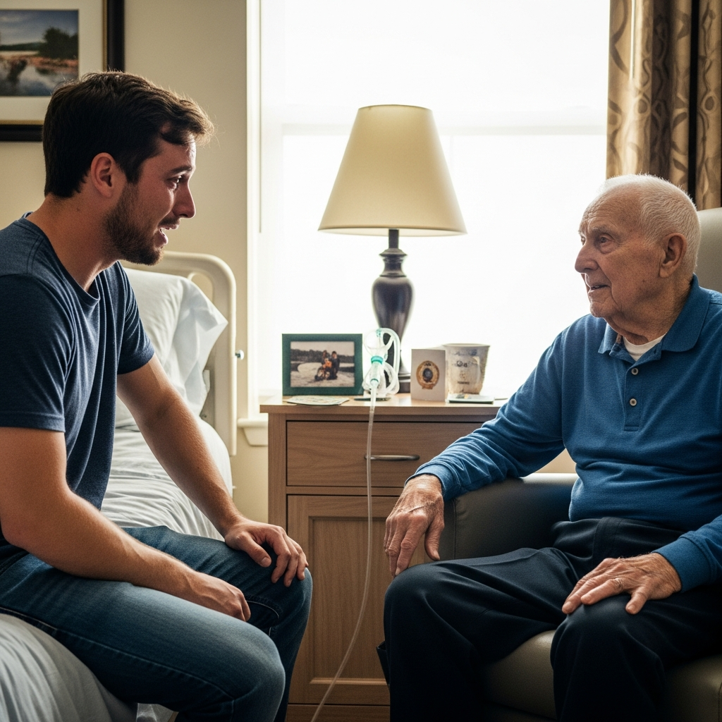 „Star,“ je preprosto rekel. „Ampak ni tako hudo. Tukaj so prijazni. Na koncu hodnika je gospa, ki mi nenehno prinaša piškote, čeprav sem sladkorni bolnik.“ Spet se je nasmehnil, nato pa je z očmi preiskal moj obraz. „Kako si, sin?“