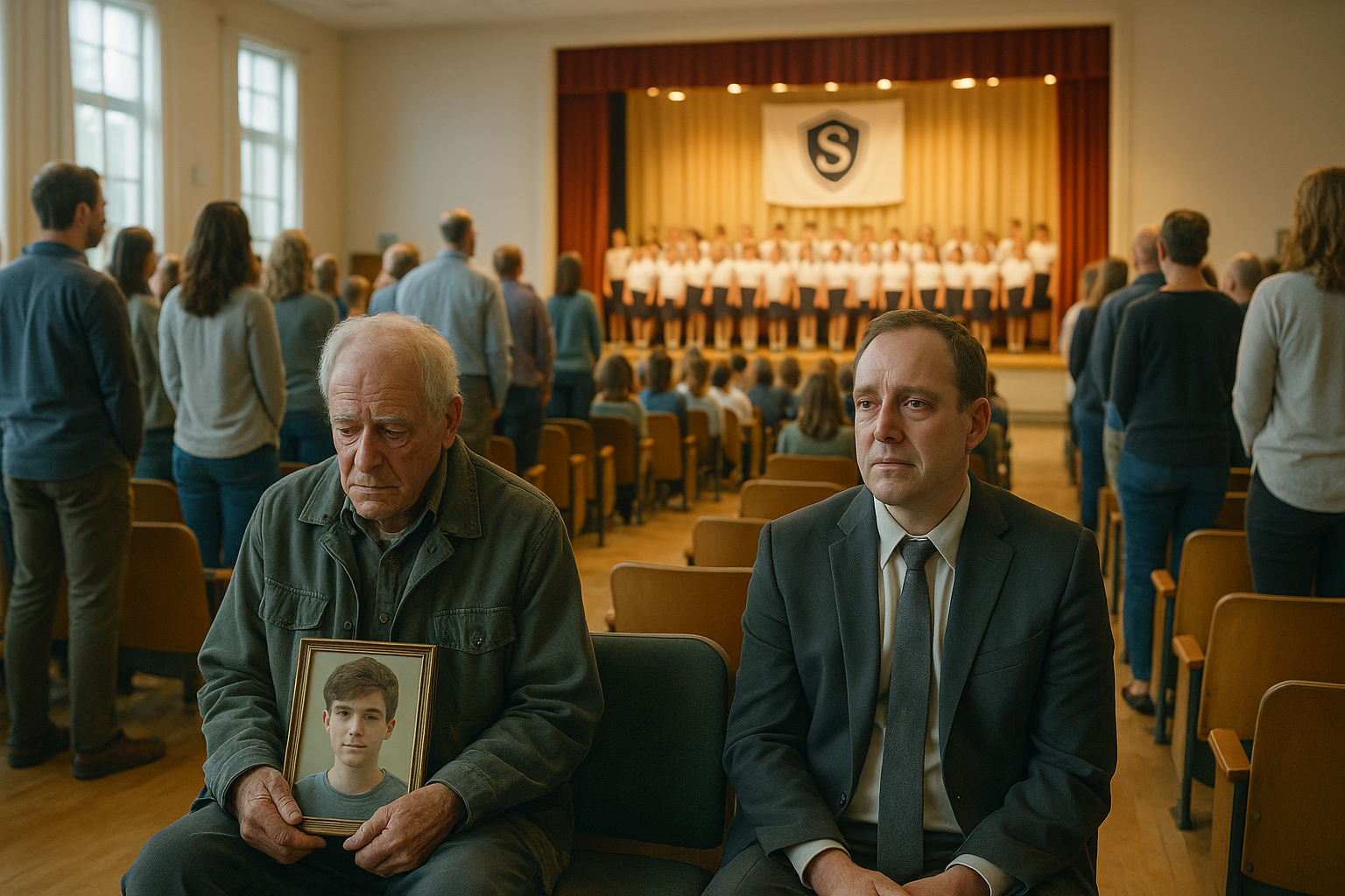 „Dragi starši,“ je rekla, njen glas je tresoč se skozi zvočnike. „Danes bomo koncert začeli drugače. Imamo gosta, ki je prišel poslušat nekoga, ki ga ni več med nami. Našo prvo pesem bi radi posvetili Danielu, ki je nekoč študiral v tej šoli, in njegovemu dedku, ki ga ni nikoli nehal čakati.“