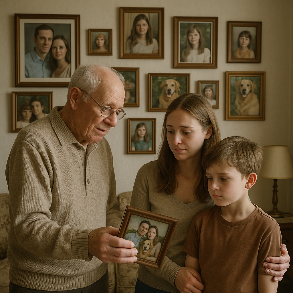 V hiši je rahlo dišalo po stari kavi in nečem zdravilnem. Na steni so visele uokvirjene fotografije, na ducate: mlajši Daniel z žensko in deklico; ista deklica, ki je odraščala; in vedno, nekje v kadru, velik zlat pes s pametnimi, smejočimi se očmi.