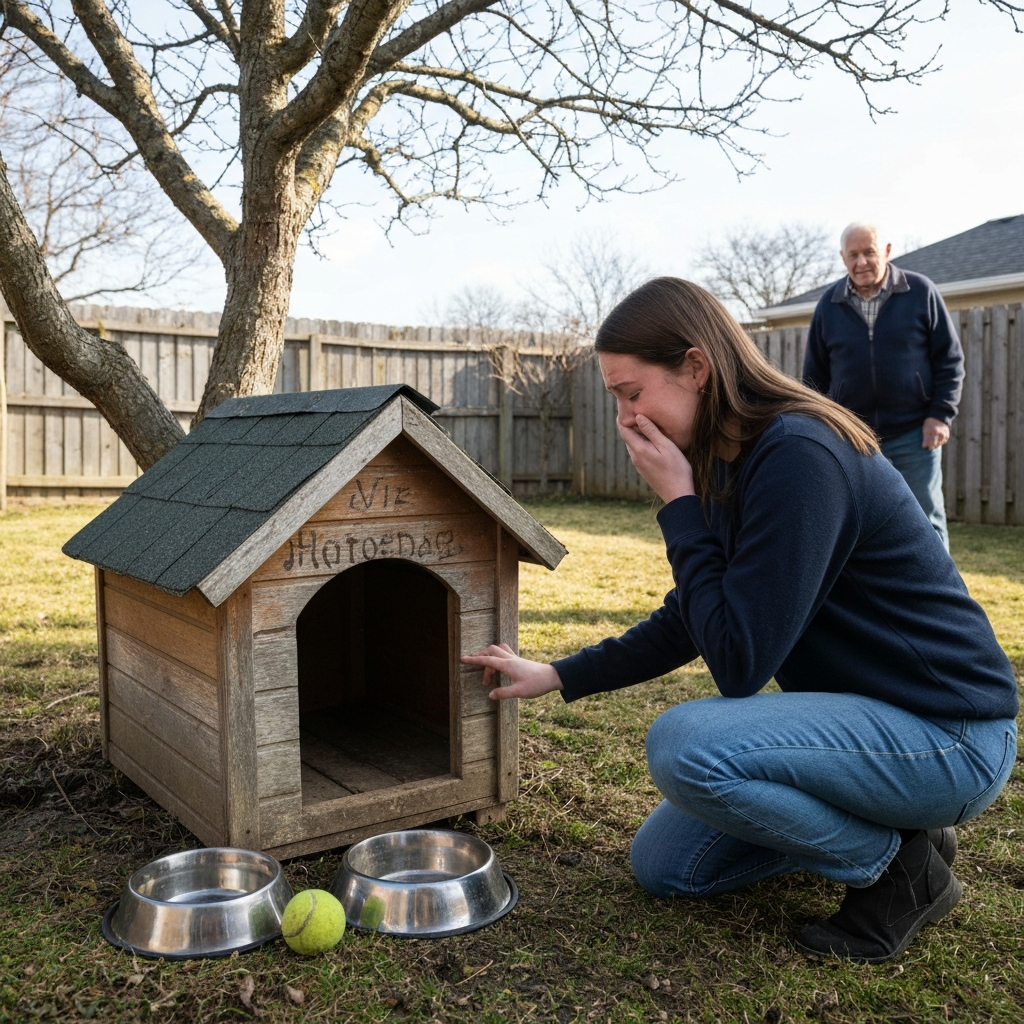 Peljal jih je do zadnjih vrat. Zunaj, pod golimi vejami drevesa, je stala majhna pasja uta, ki jo je Emma videla z ulice. Skleda ob njej se je svetila. Zraven je ležala obrabljena teniška žogica.
