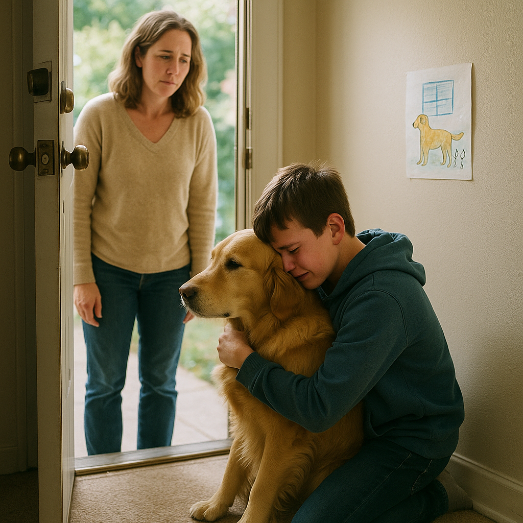 “Vi ste družina z zlatim prinašalcem,” je tiho rekla. „Ves čas je govoril o tvojem psu.“