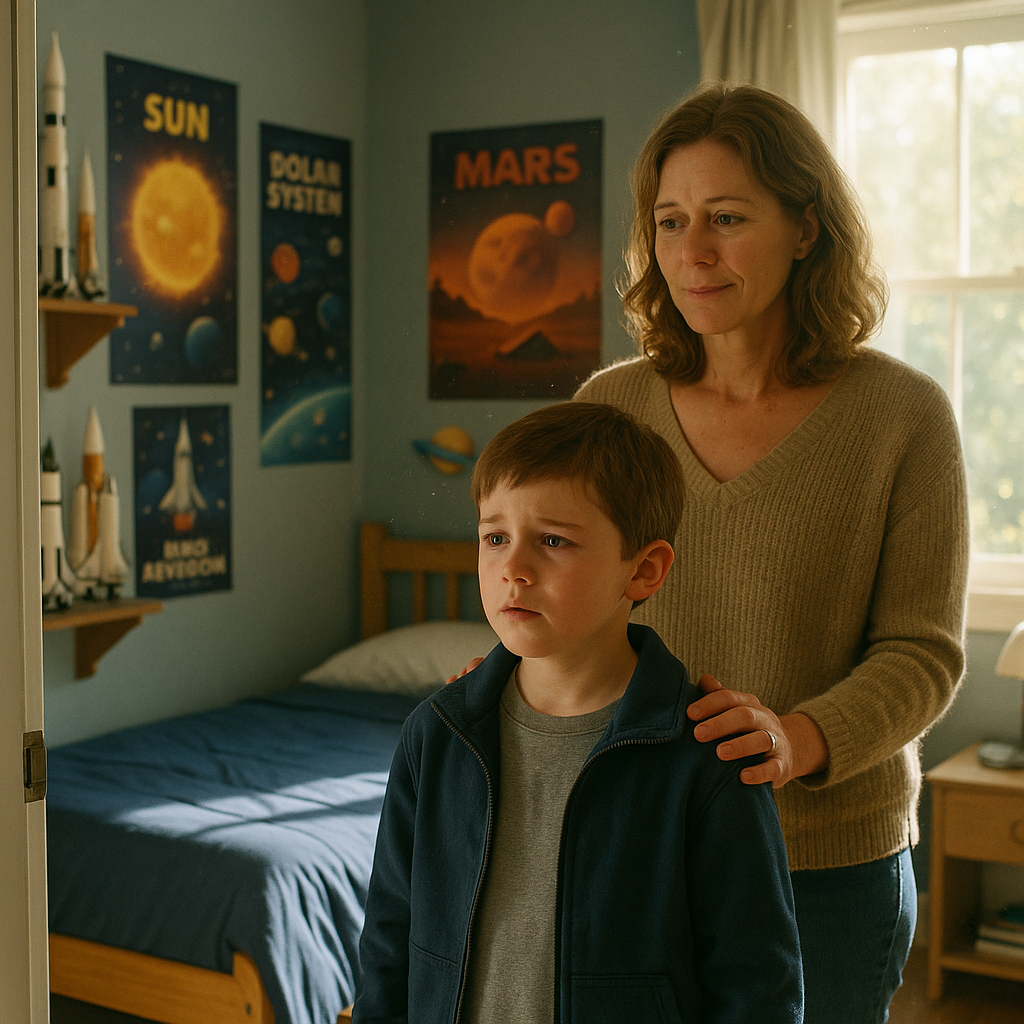 Sončna svetloba se je razlila po plakatih na stenah, policah s knjigami, modelih raket, zamrznjenih med letom. Tokrat me pogled na to ni strl. Namesto tega sem ga videla skozi Lucasove oči: fantovski svet, poln sanj, ki niso povsem umrle, ker so bile skupne.