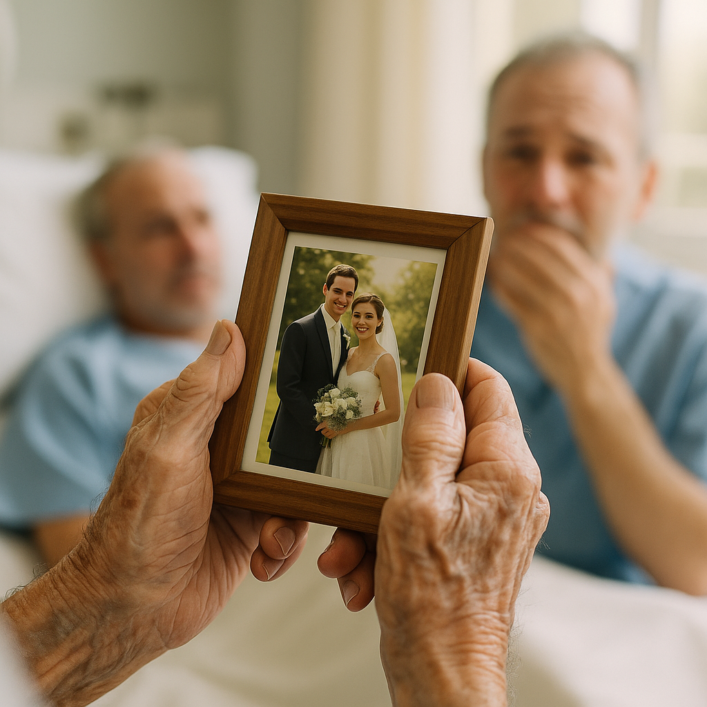 Sliko je pogledal z nežnostjo, ki me je bolela. »Medicinska sestra jo je našla,« je rekel. »Vprašala me je, če se spomnim, kdo sta. Jaz … Rekel sem ji, da je to moja žena, da jo ima pri roki. Ampak vedel sem.« Glas se mu je zlomil. »Vedel sem, da je to moja Emma. Srečna. Varna. Z moškim, ki jo drži v objemu, kot jaz še nikoli nisem nikogar.«