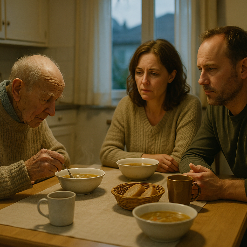 Sedeli smo za mizo, vsi trije. Michaelove roke so se tako tresle, da je Daniel tiho z eno roko držal skledo, ne da bi se kaj motil. Michael je med žlicami govoril – o vrtu z vrtnicami, o psu po imenu Lucky, o majhnem fantku, ki mu je stekel v naročje in kričal „Dedek, dedek!“