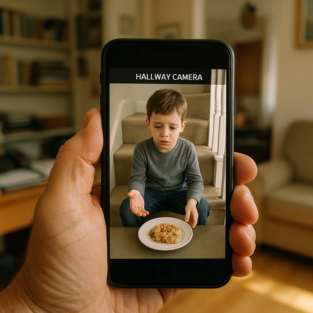 Posnetek se je naložil: časovni žig, tihi hodnik, nato majhni premiki. Ob 19:03 so se vrata stanovanja 3B odprla. Daniel je previdno stopil ven, uravnotežil krožnik z dvema rezinama toasta. Postavil ga je na stopnice, ga poravnal, kot da bi bilo to pomembno, zašepetal nekaj neslišnega in se vrnil noter.