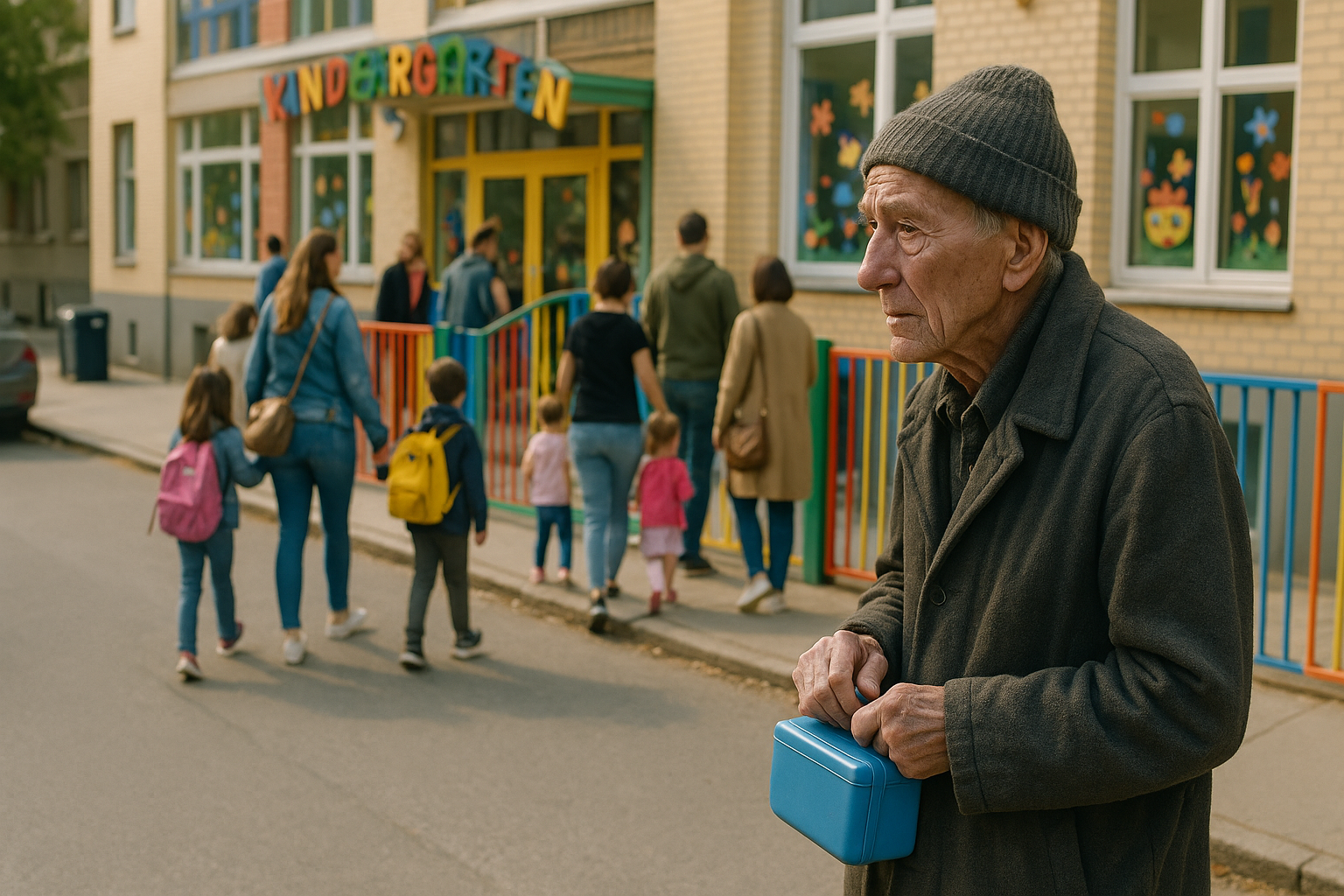 Starec ni samo stal in opazoval. Iz torbe je vzel nekaj – majhno modro škatlo za malico – in jo odprl. Para se je dvignila v hladen zrak. Pogledal je vrata vrtca s tako lakoto in nežnostjo, da je Emma začutila vozel v grlu.