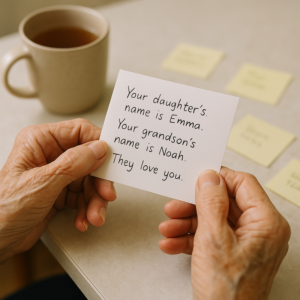 Helen je sedela za mizo v svojem ponošenem kardiganu, pred seboj je stala skodelica čaja, iz katere se je lenobno valila para. Zraven skodelice je bil ličen kupček majhnih listkov. Nekateri so pisali: »Ugasni štedilnik.« Drugi: »Zakleni vrata.« Eden, napisan s skrbno, skoraj otroško roko: »Vaši hčerki je ime Emma. Vašemu vnuku je ime Noah. Radi te imajo.«