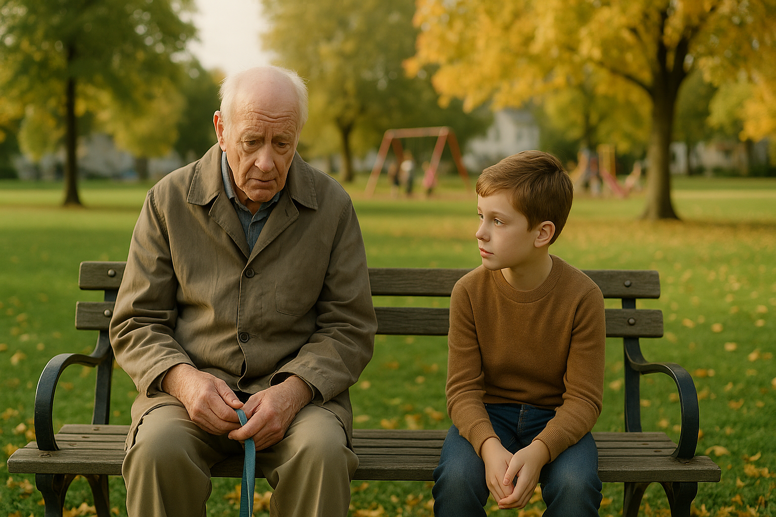 Bila je zgodnja jesen v majhnem mestnem parku. Trava je bila še zelena, a pod klopmi so se že nabirali prvi rumeni listi. Ljudje so šli mimo starca, ne da bi ga zares videli: bil je le še ena osamljena postava v zmečkanem sivem plašču. Le povodec v njegovih rokah je pritegnil pogled: skrbno ovit okoli prstov, kovinska sponka zloščena od nenehnega dotika.