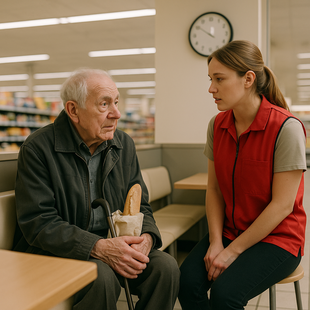 Nazaj v supermarketu je mlada uslužbenka pospravila prazno klop in obrisala mizo. Enkrat je pogledala proti vratom, kjer sta izginila starec in njegov sin, in si privoščila majhen, olajšan nasmeh.