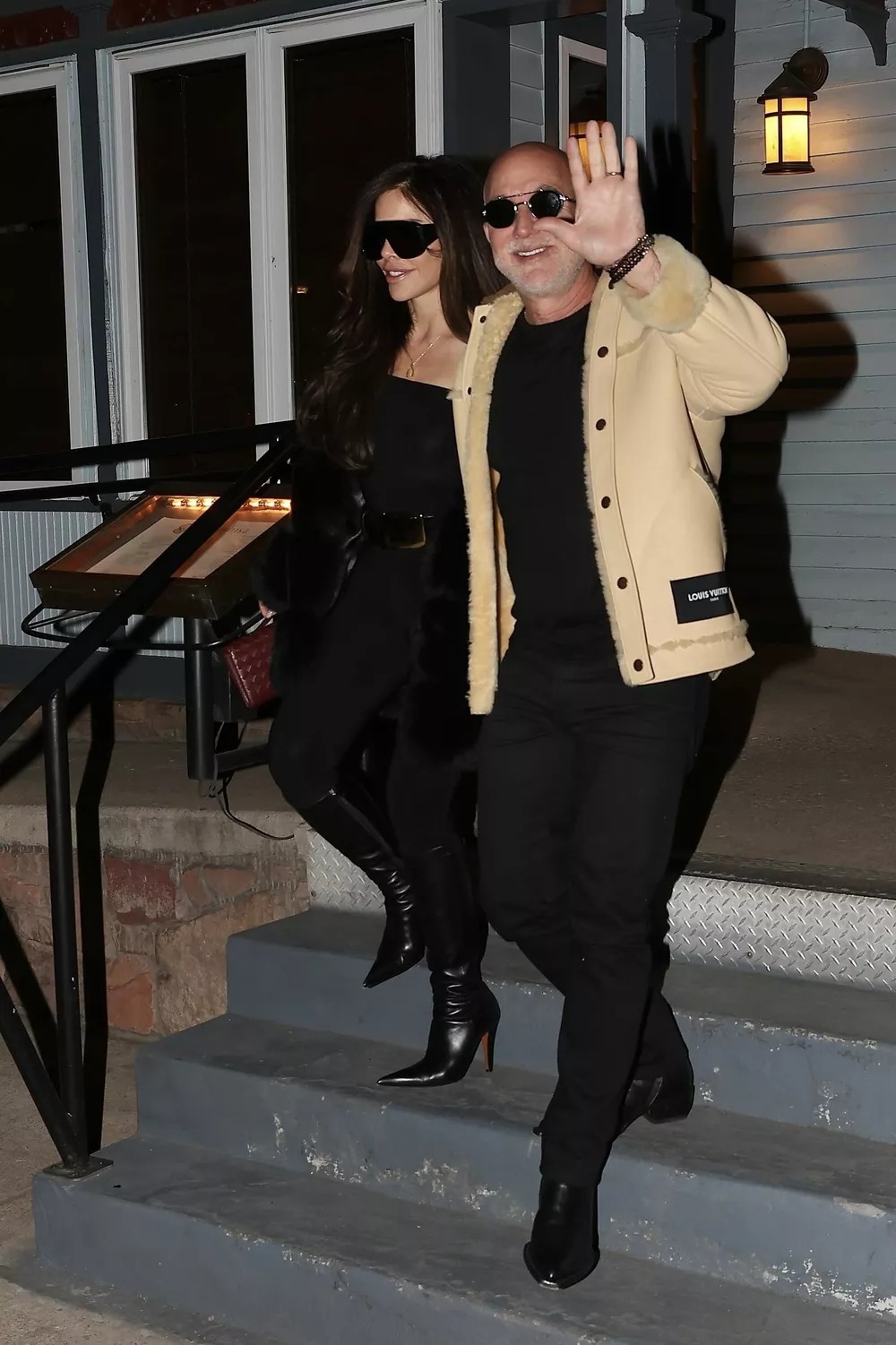 Namesto kričečega dizajnerskega teatralnega videza se je Sánchez odločila za elegantno, diskretno eleganco: oprijet kombinezon z odprtimi rameni, stisnjen v pasu, v kombinaciji z visokimi črnimi usnjenimi škornji. Videz je zaokrožila s plišasto črno krzneno jakno in nosila temno bordo torbo Bottega Veneta, s čimer je dosegla popolno ravnovesje med razkošjem in diskretnostjo. Bezos se je od glave do pet ujemal z vzdušjem v črni barvi, saj se je proti alpskemu hladu oblekel v ovčji plašč Louis Vuitton.