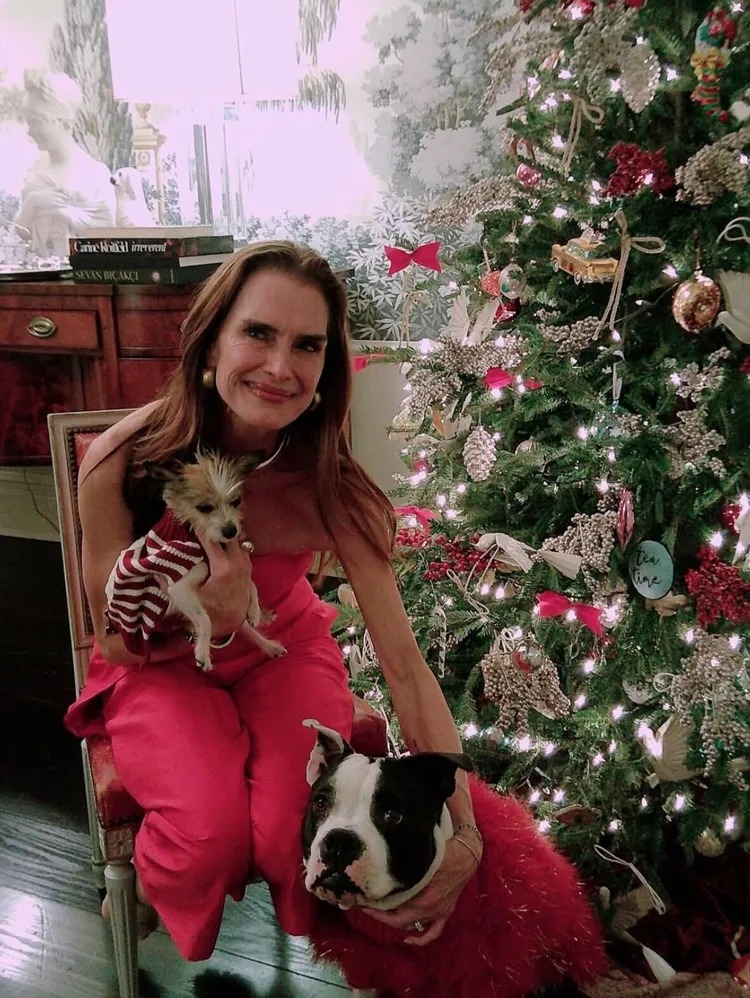 Praznovanje se je začelo doma, kjer je Shields predstavila čisto novega kosmatega člana družine. Pozirala je ob žarečem božičnem drevescu, v naročju je držala svojega majhnega novega psa, oblečena v drzen rdeč bodi, in dokazala, da so tudi njeni tihi trenutki elegantni. Sporočilo je bilo jasno: božič je uradno postal slajši – in glasnejši.
