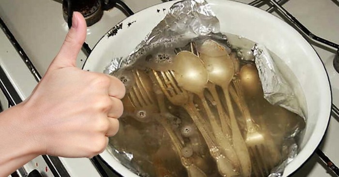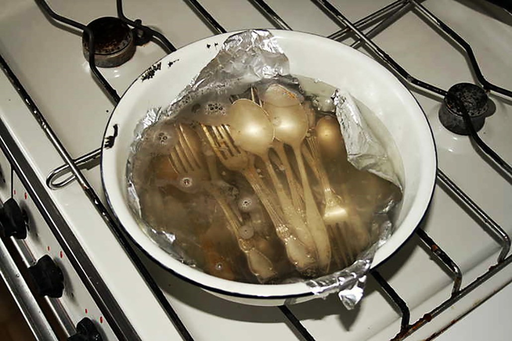 Jedilni pribor s porcelanskim ročajem ali srebrn pa zahteva drugačen pristop. Za te kose obložite dno lonca z aluminijasto folijo in nanj položite jedilni pribor. V ločeni posodi raztopite petdeset gramov soli in petdeset gramov sode bikarbone v enem litru vode, nato pa raztopino vlijte v lonec.