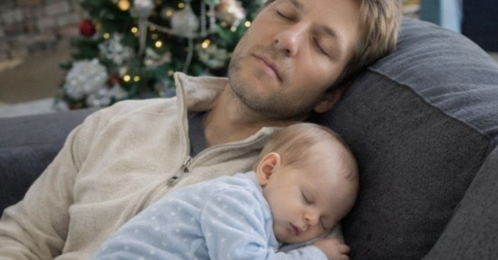 Mark je spal na kavču. Novorojenček je bil povit v povoje na njegovih prsih.