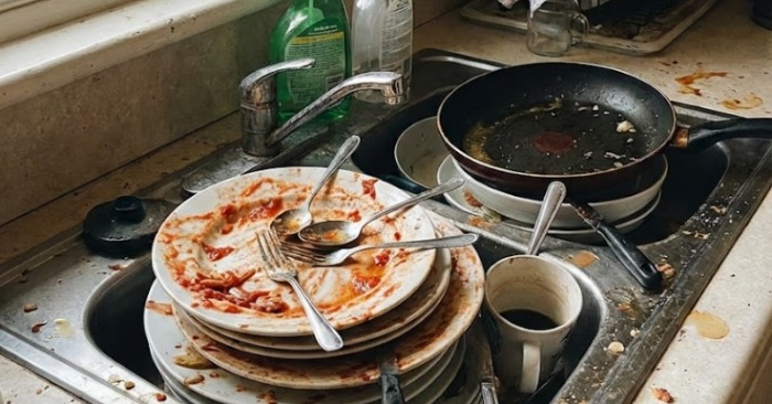 Luči so bile ugasnjene, igrače so bile raztresene po dnevni sobi, ni bilo vonja po hrani in pomivalni stroj je bil odprt.