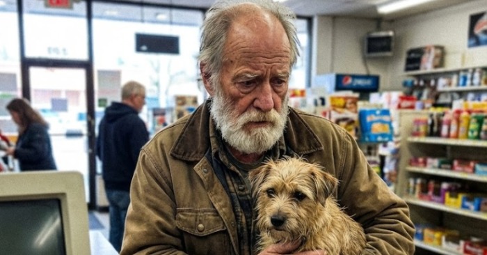 Pri tretji blagajni je stal starec. Videti je bil star okoli petinsedemdeset let. Nosil je flanelasto jakno, pleteno kapo in imel sive lase. V košari je imel mleko, kruh, jajca, konzervo juhe – in dve vrečki pasje hrane.