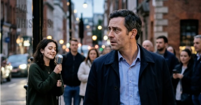 Na vogalu ulice, obkrožen z majhno množico. Pel je, z zaprtimi očmi, mirnim obrazom, kot da bi povsem pripadal glasbi.