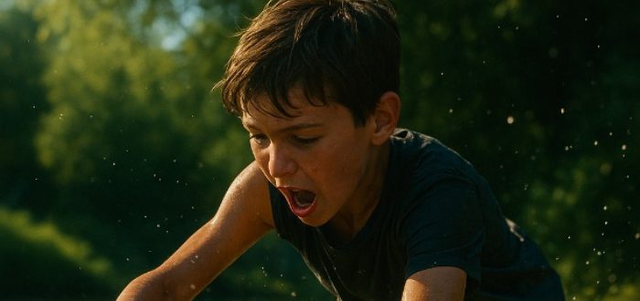 Poletni dan, vroč in brez oblakov. Reka se je lesketala v soncu, otroci so se kopali ob bregu, se smejali in gradili splave iz vej. Nihče ni opazil,