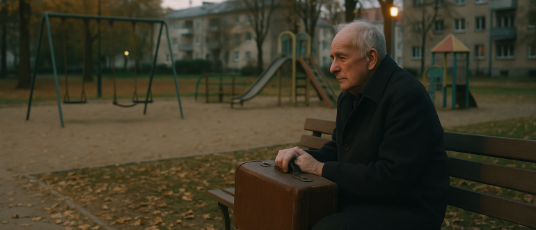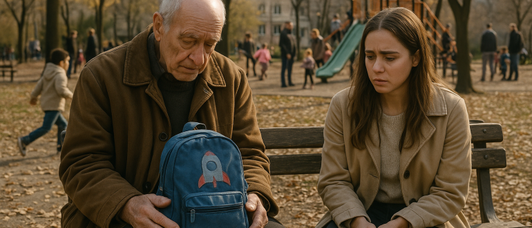 Starec je vsak dan sedel na isti klopi v parku in stiskal majhen moder nahrbtnik, dokler ga nekega popoldneva ni prepoznal neznanec in tiho rekel: »Mislim, da je