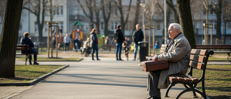 Starec, ki je tri dni sedel na klopi v parku s kovčkom na kolenih in čakal sina, ki ni vedel, da je njegov oče še živ. Tretji večer,