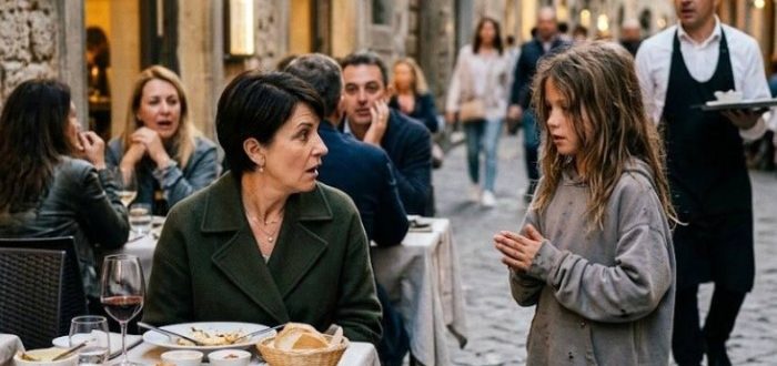 Sredi mirnega popoldneva se je v eni najuglednejših mestnih restavracij zgodil nepričakovan trenutek. Majhna, bosa deklica, v obrabljenih in prašnih oblačilih z ulice, se je pojavila za mizo,